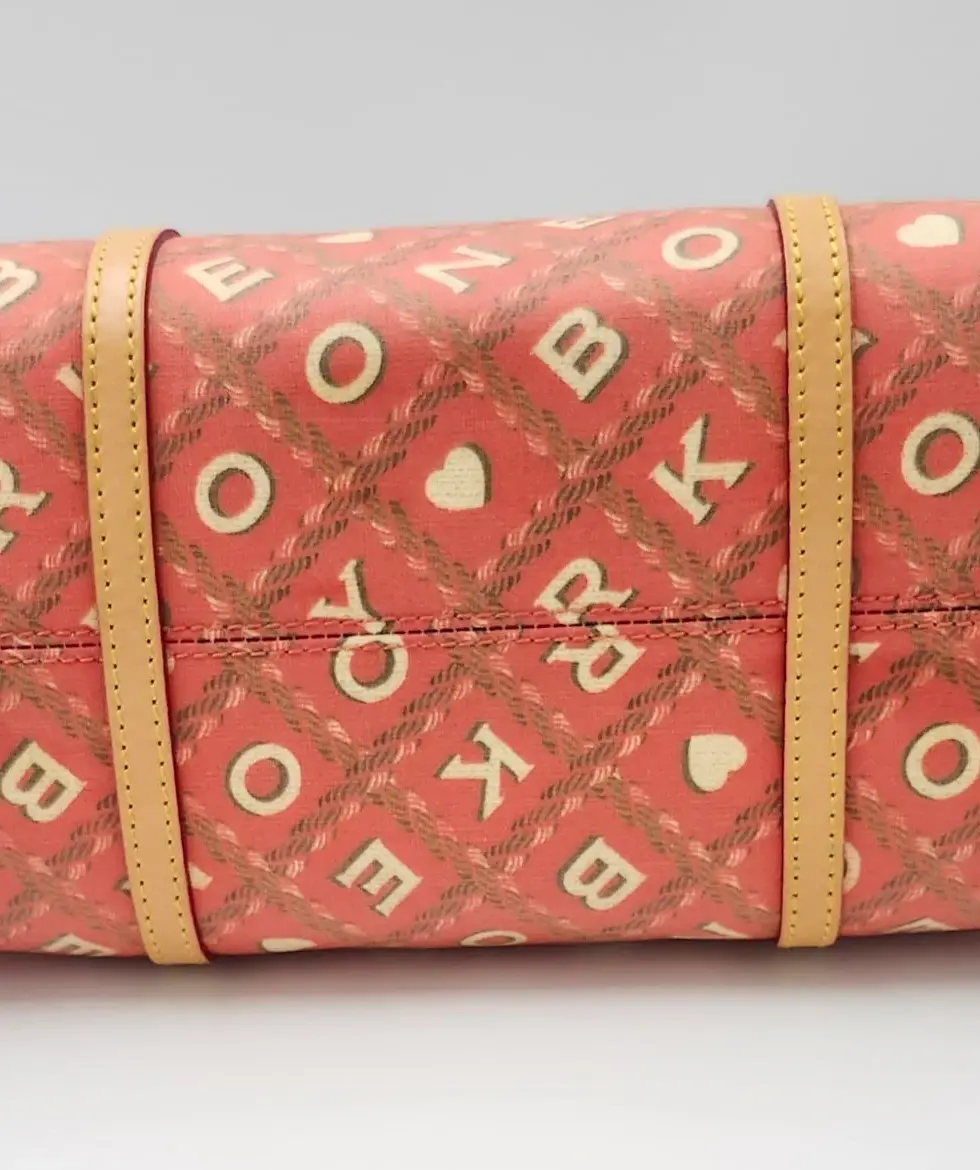 - Made from high-quality printed canvas with the iconic Dooney & Bourke signature pattern in a delightful peach hue.